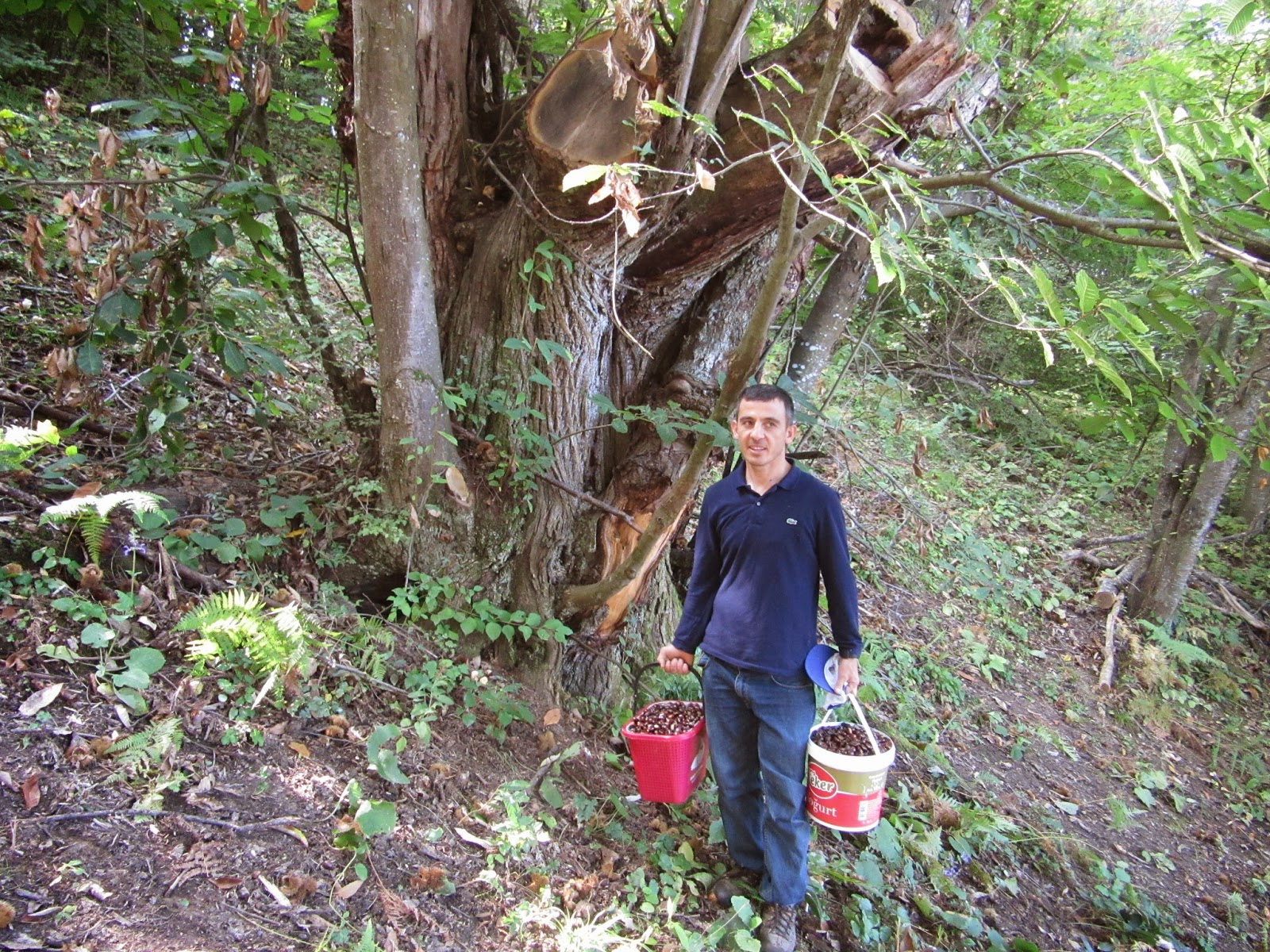 Kestane tarlasında devasa bir kestane ağacı. Kestaneler hastalanıyor muş, kademe kademe kesip kurtarmaya çalışıyorlar...