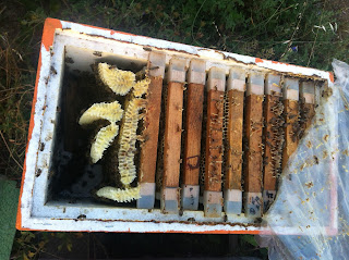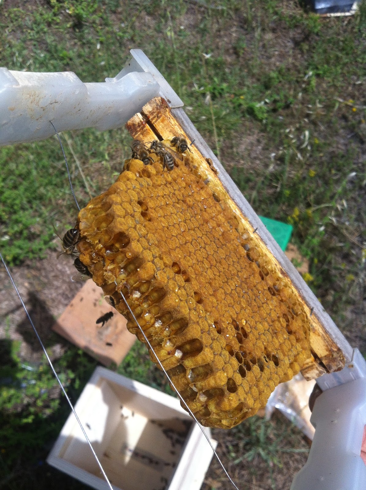 Bir kovana çıta eksik gelmiş katta iki çıta arasına arı dalak örüp kestane balı koymuş.