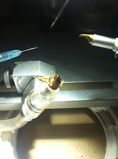 İğne olan yeri dibinden maket bıçağı ile kesiyorum, arkasına eczaneden aldığım damlalık lastiklerini taktık mı ölçü hazır...