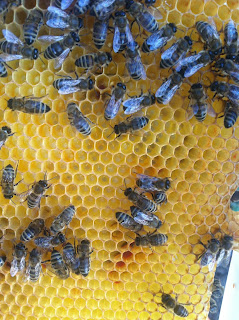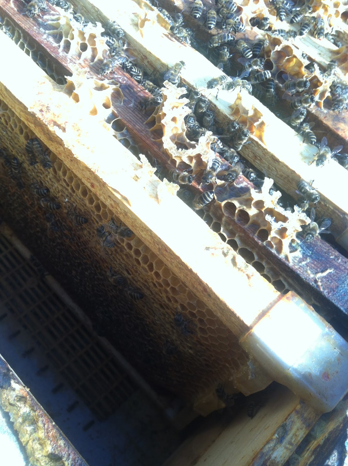 Erkek üretimine ayrılmış kovanlarda bal sıkıntısı yok, bu kovana daha hiç şurup vermedim, ortada üç çıtada yavru başlamış.