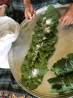 Köyde topladığımız yaprakları annem tuzlayıp salamuraya hazırlıyor.