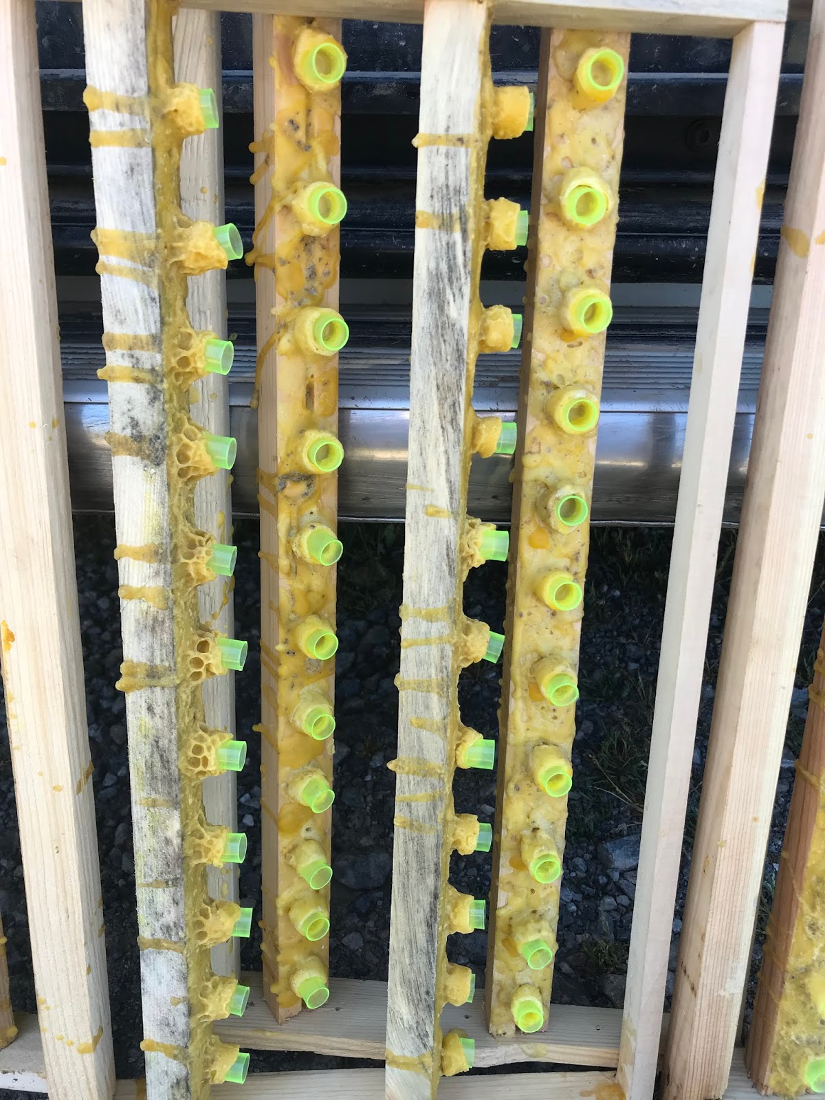 Bu çıtada yavru yapılmış uzun süre yavru yapılmayınca yavru kenarına polen depolanmış, tekrar bir iyi döneme geçilince polenin etrafına yeniden yavru yapılmış. Çıtadaki görüntüden ne kadar gel gitler olmuş görünmekte.