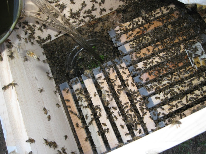 Arıları silkelemeden arılı koloni yerinden alınıp bu kovanı aldığımız koloninin yerine koyuyoruz. Koloniyi bu ham çıtalı koloniye silkeledik, işçi arıların balları polenleri ve örülmüş petekleri yok, ama anaları var::))